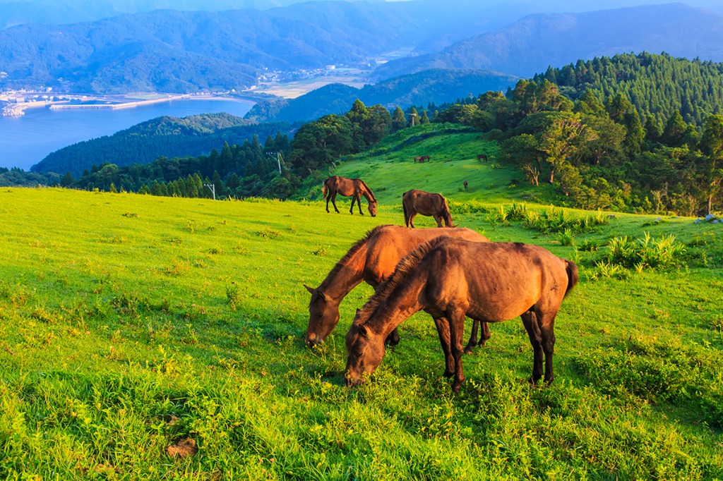 日向灘(ひゅうがなだ)の絶景が広がる野生馬たちの楽園!まるで、海外のような雄大な景観を誇る都井岬は、宮崎県最南端に位置する日南海岸国定公園。また野生馬は、国の天然記念物の日本在来馬の一種「御崎馬(みさきうま)」と言って、約70頭も生息しています。