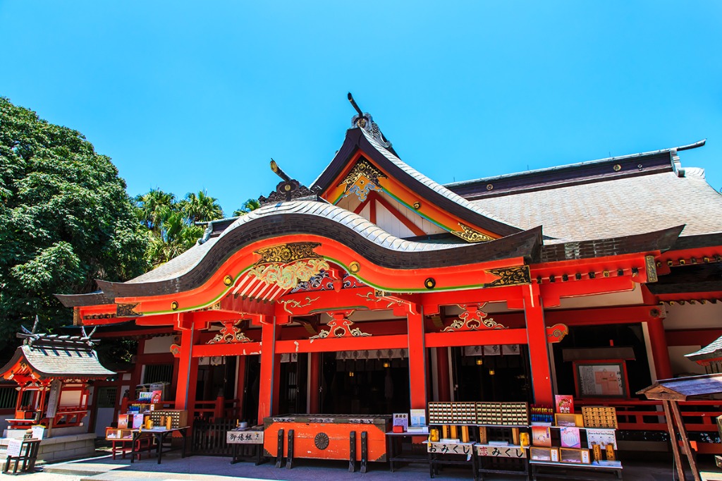 宮崎の定番観光スポット!島全域が境内で、中央の社には島にかかる弥生橋を渡って参拝することができます。さらに、樹齢300年を超えるビロウ樹や亜熱帯植物が生い茂っており、南国ムード満点。この神社は、有名な神話「海幸彦・山幸彦」の舞台で、縁結びにご利益があると知られているパワースポットでもあります。