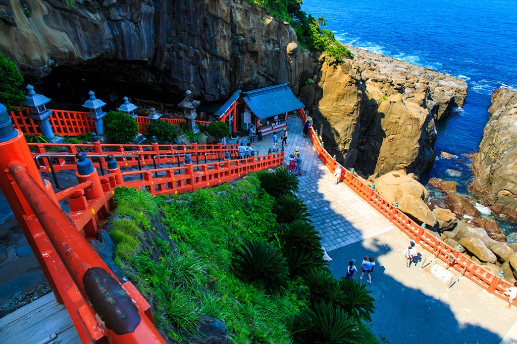 鵜戸崎岬の突端にある洞窟の中に、御本殿が鎮座しています。国の名勝として指定されています。また、太平洋を眺めながら、奇岩が連なる自然の神秘を感じる景観が絶景!この神宮は、安産・育児・縁結びなどにご利益があるとされています。また、本殿前の「亀石」に男性は左手、女性は右手で運玉に願いを込めて投げて、枡形のくぼみに入ったら願いが叶うと言われています。